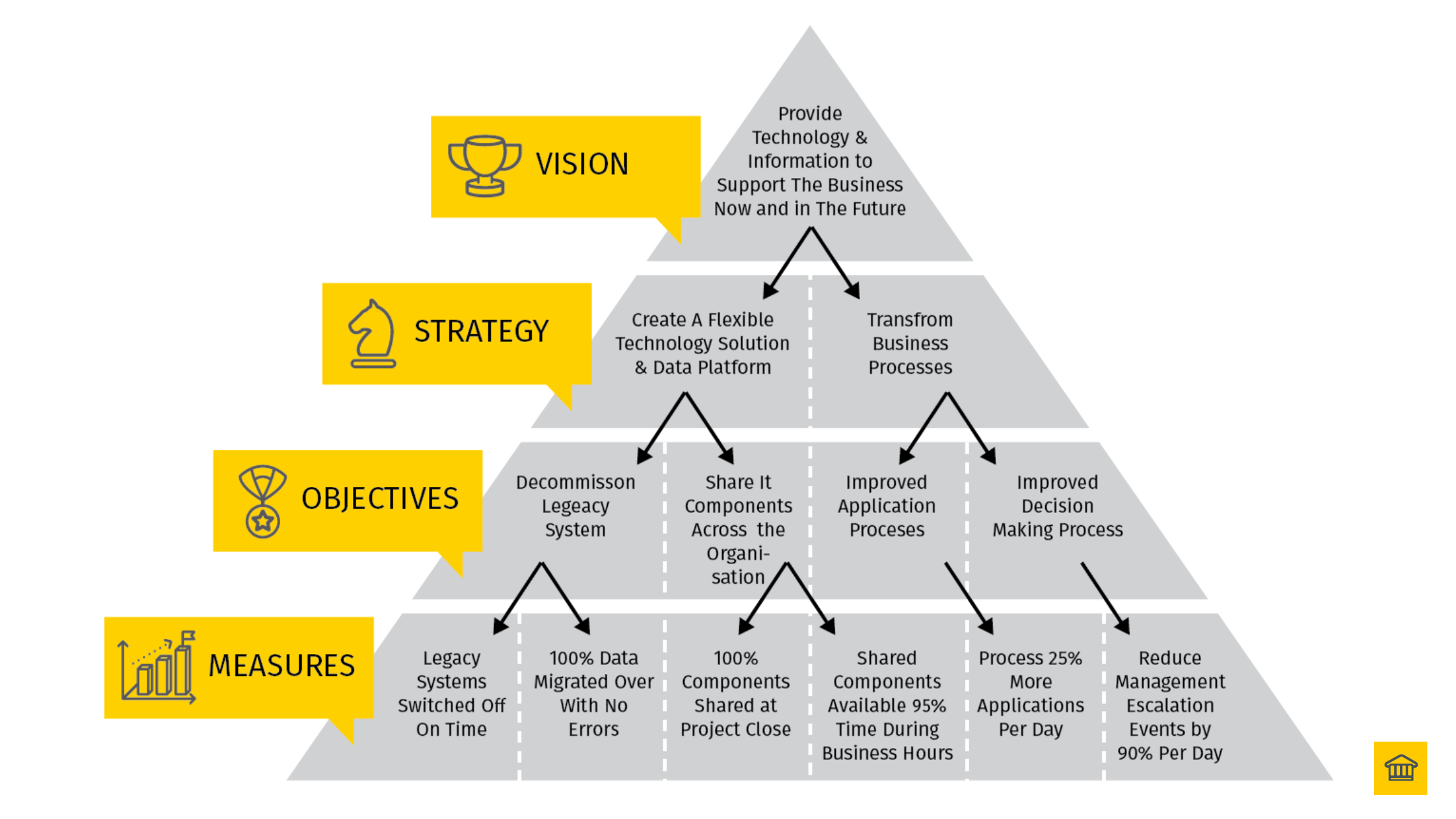 In order to transform your business, you need to have a baseline understanding of the business 'today'. You've been told you need to assess any and everything (that's the old outdated methods, that end in failure). There are key parts of the organisation you need to understand – we call that the Business Architecture. We will introduce you to the Analysis-Design pyramid to help you define the baseline and shortcut this step, getting what you need (and only what you need), fast!