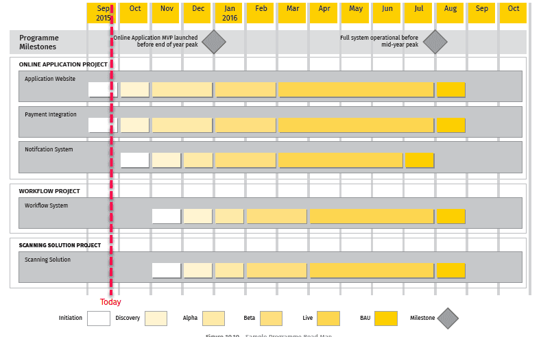 - Give them a strawman. The strawman is the high-level plan to implementation. If you adopt an approach like GDS (Gov Digital Standards) follows for example, there are a number of phases which could range (depending on your programme) from 1-month to 5/6-months. Depending on the number of projects, or workstreams within a single project your roadmap could look something like this: